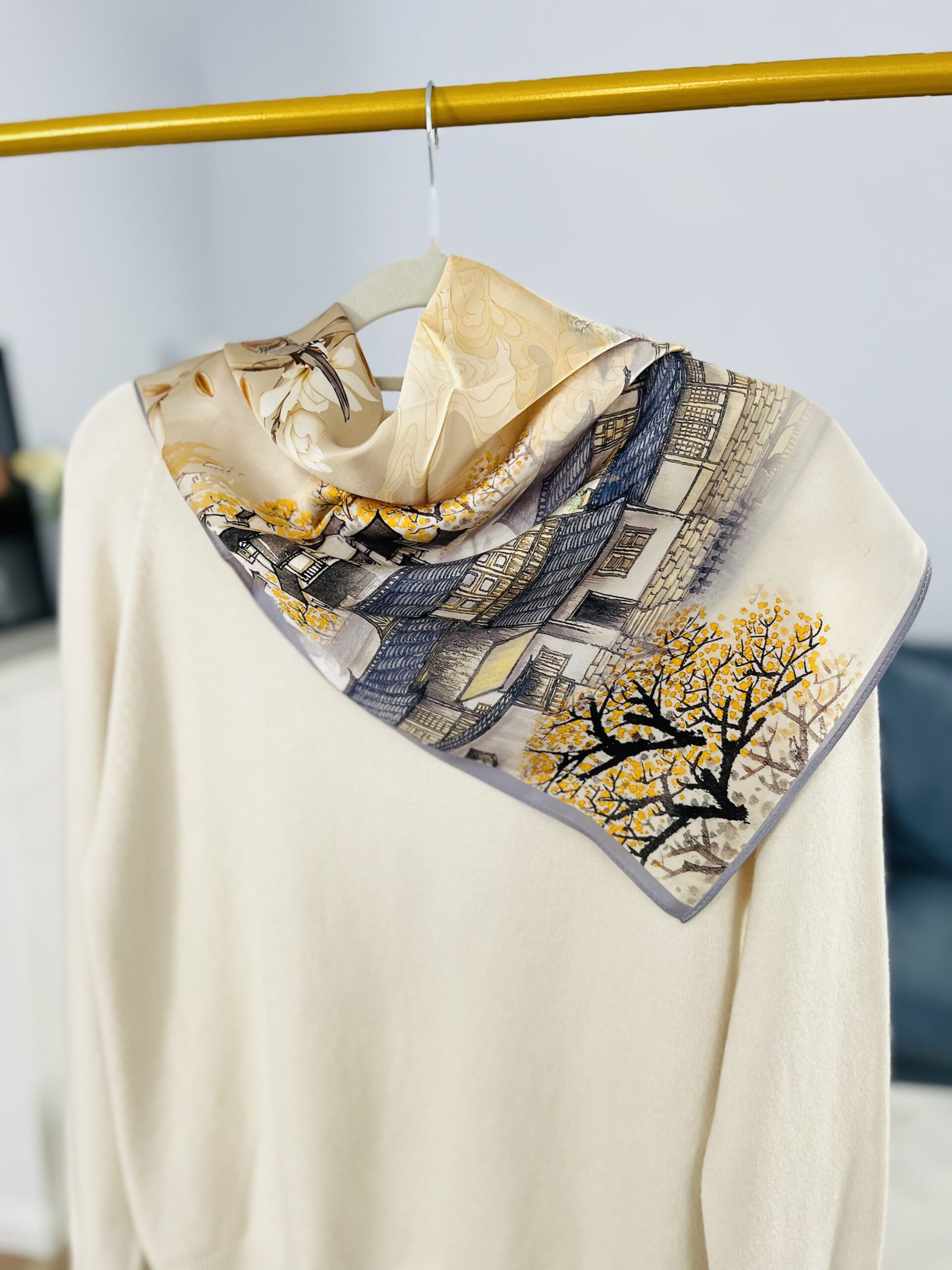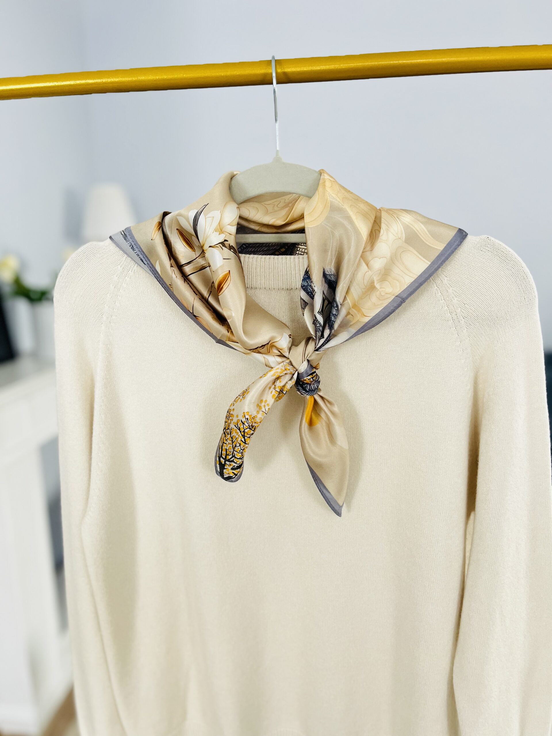 - ZJAWISKOWA! leciutka niczym puch apaszka wykonana w 100% z oryginalnego jedwabiu chińskiego. Z elegancką grafiką- w przepięknych barwach: złota, granatu, jasnego i ciepłego beżu- idealna do wielu stylizacji. Gładka i delikatna w dotyku, jednocześnie bardzo wytrzymała. O charakterystycznym dla prawdziwego jedwabiu widocznym połysku. Lekka, zwiewna, bardzo komfortowa w użytkowaniu. Wymiar pozwala na wiele zastosowań: owinięcie wokół szyi, wykonanie dekoracyjnej opaski, zawieszenie jako dekoracja przy torebce, wykonanie jedwabnego kwiatu do zawiązania na szyi. KLASYK, który posłuży długie lata – tego typu akcesoria nigdy nie wychodzą z mody, a ich PREMIUM skład sprawia, że zawsze będą w świetnej formie. Dlatego też, to świetny pomysł także na prezent dla bliskiej osoby.