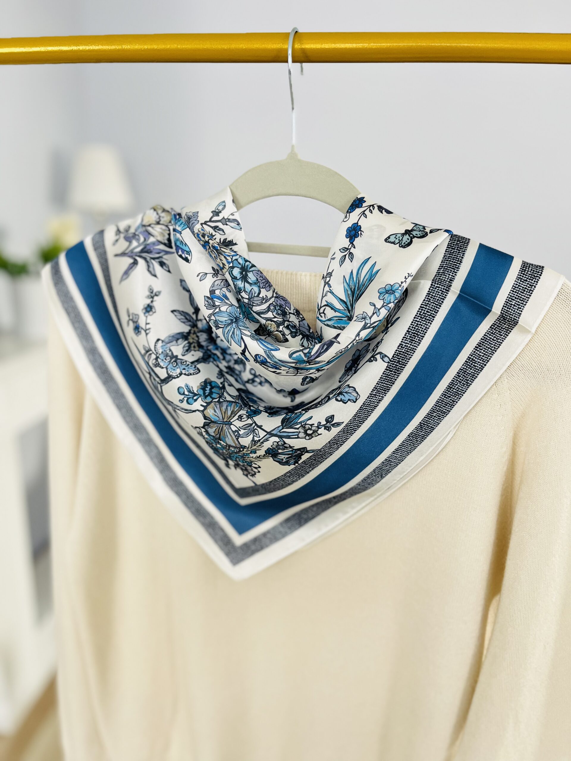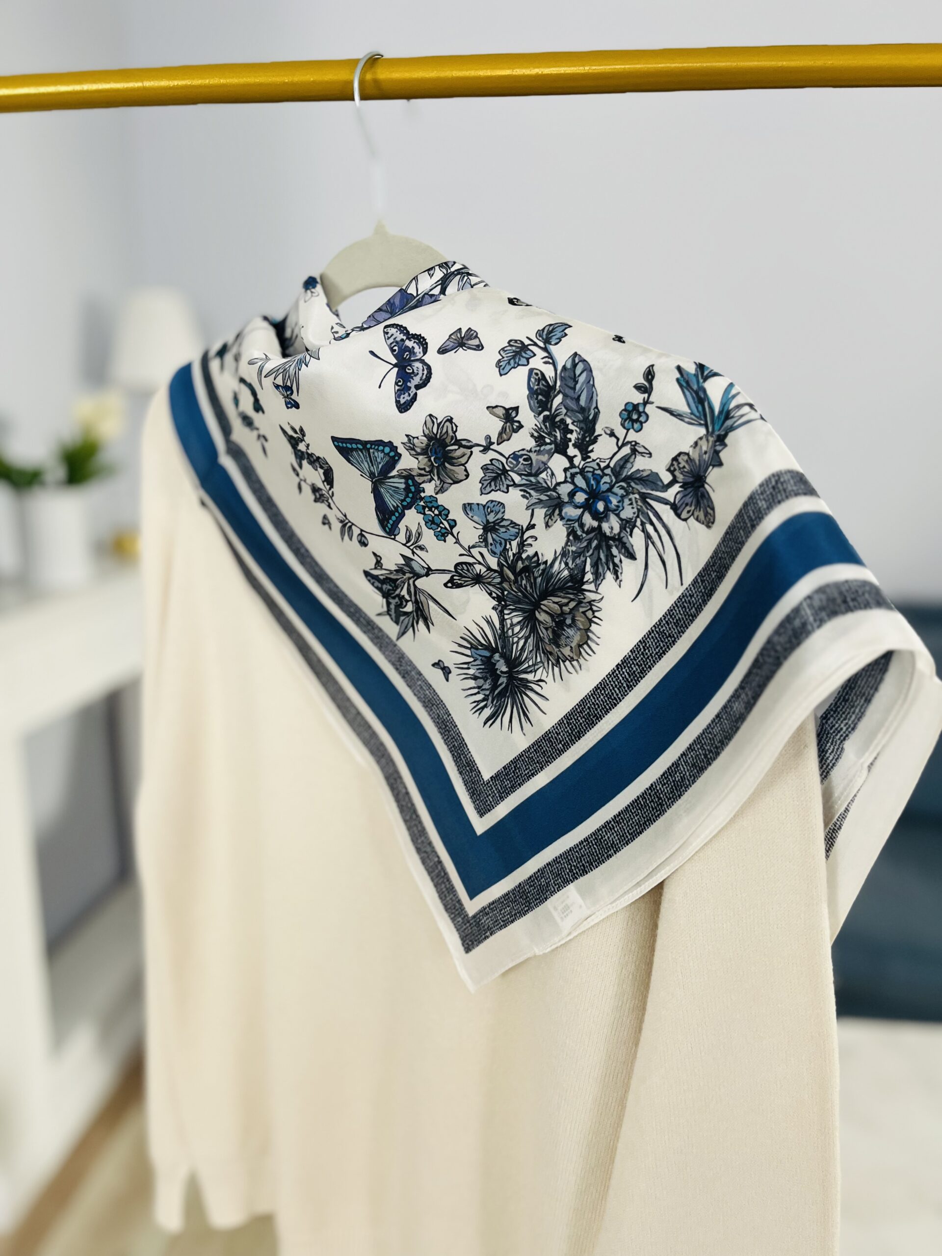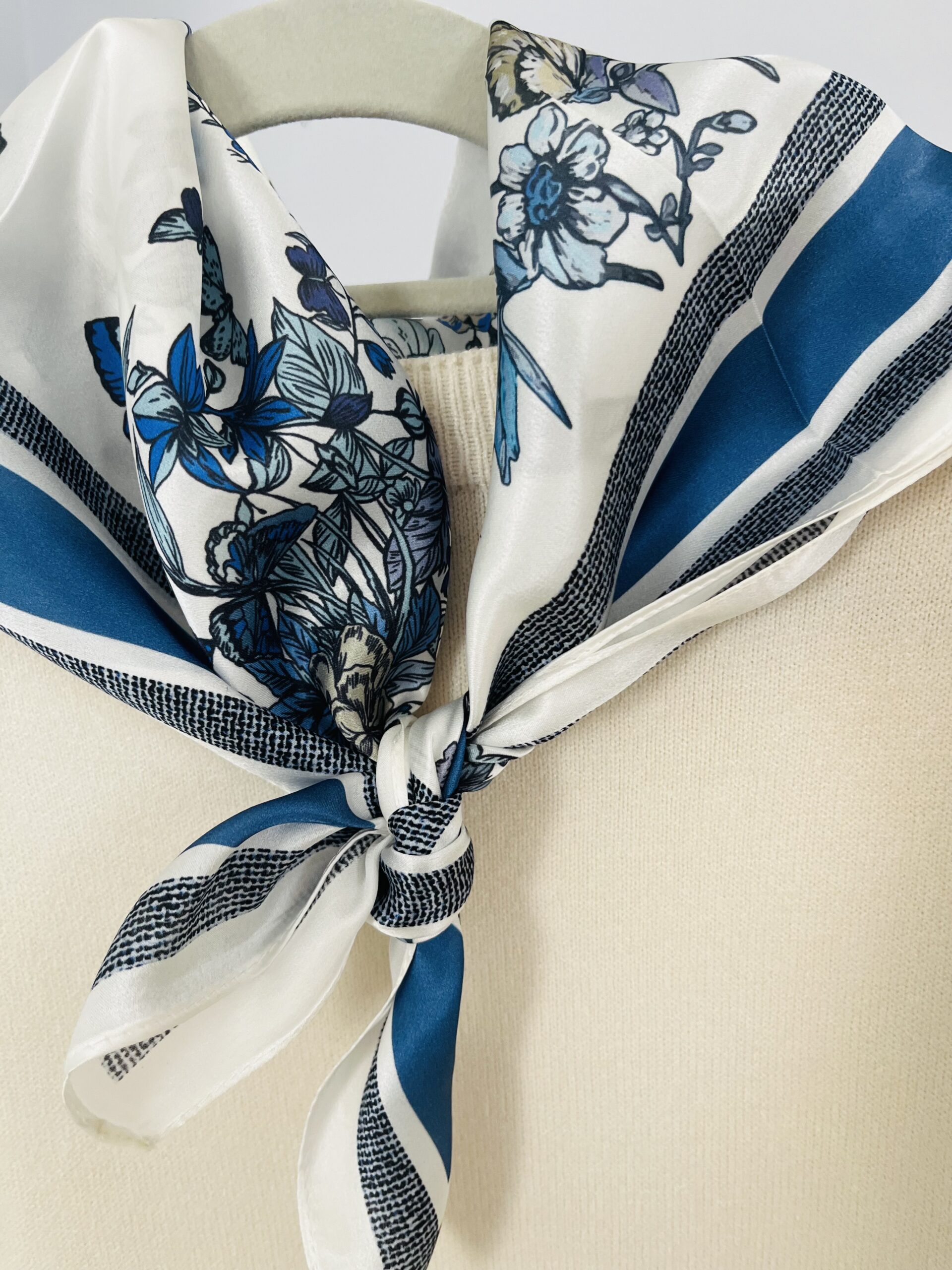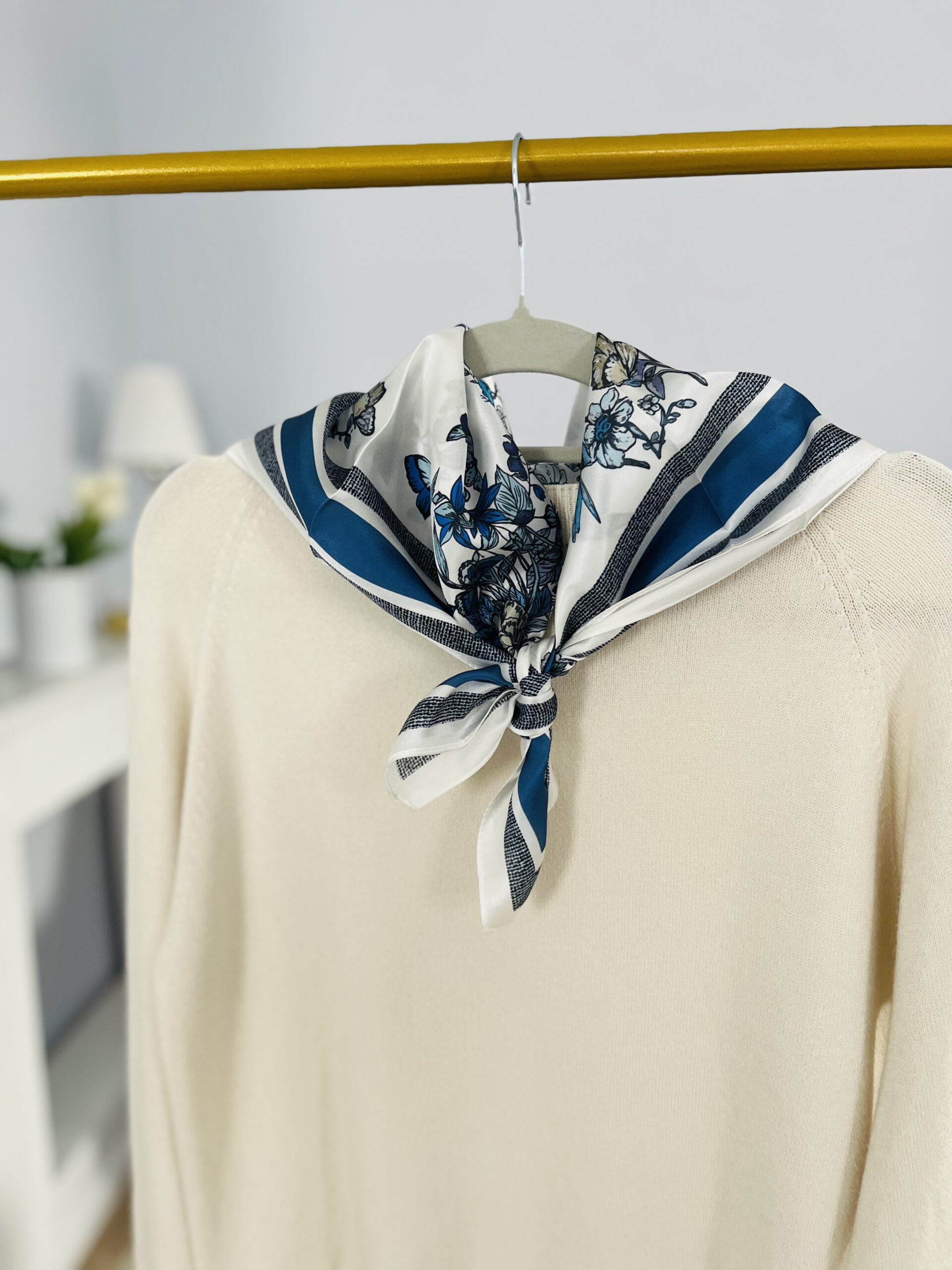 - ZJAWISKOWA! leciutka niczym puch apaszka wykonana w 100% z oryginalnego jedwabiu chińskiego. Z elegancką grafiką- w przepięknych barwach: błękitu, granatu, jasnego beżu – idealna do wielu stylizacji. Gładka i delikatna w dotyku, jednocześnie bardzo wytrzymała. O charakterystycznym dla prawdziwego jedwabiu widocznym połysku. Lekka, zwiewna, bardzo komfortowa w użytkowaniu. Wymiar pozwala na wiele zastosowań: owinięcie wokół szyi, wykonanie dekoracyjnej opaski, zawieszenie jako dekoracja przy torebce, wykonanie jedwabnego kwiatu do zawiązania na szyi. KLASYK, który posłuży długie lata – tego typu akcesoria nigdy nie wychodzą z mody, a ich PREMIUM skład sprawia, że zawsze będą w świetnej formie. Dlatego też, to świetny pomysł także na prezent dla bliskiej osoby.