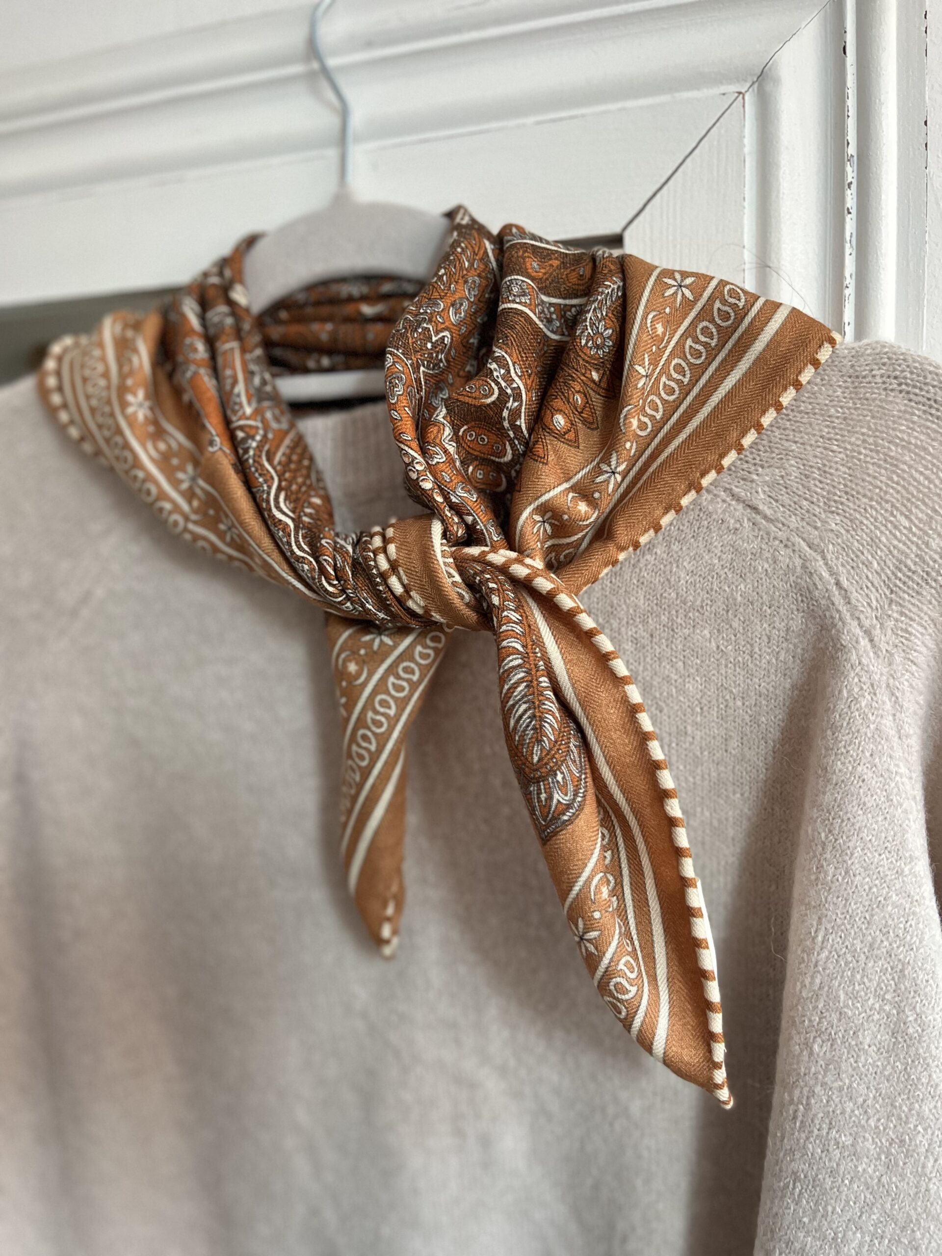 ZJAWISKOWA! leciutka niczym puch i bardzo ciepła apaszka wykonana w 30% z oryginalnego jedwabiu chińskiego oraz w 70 % z wełny. Przepiękna apaszka w barwach brązu, pomarańczy, cynamonu i ecru, co czyni ją niezwykle uniwersalną i pasującą do wielu stylizacji. Bardzo elegancka o nietuzinkowym wzornictwie.