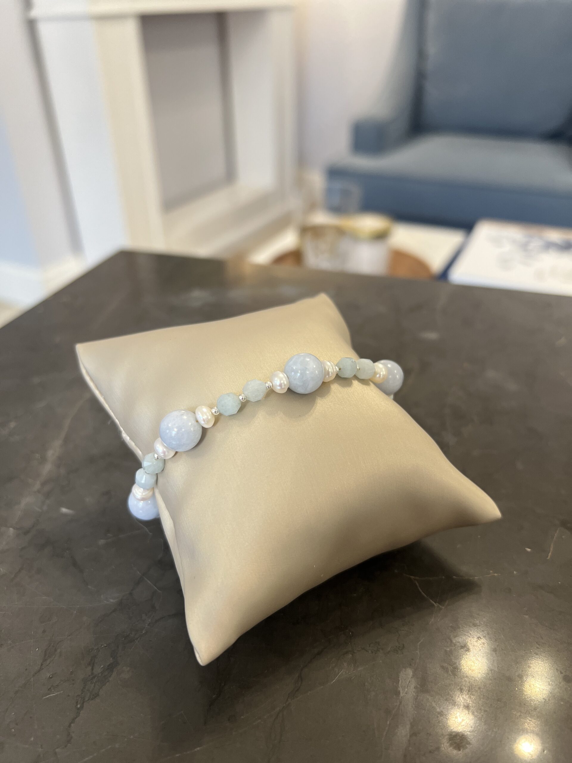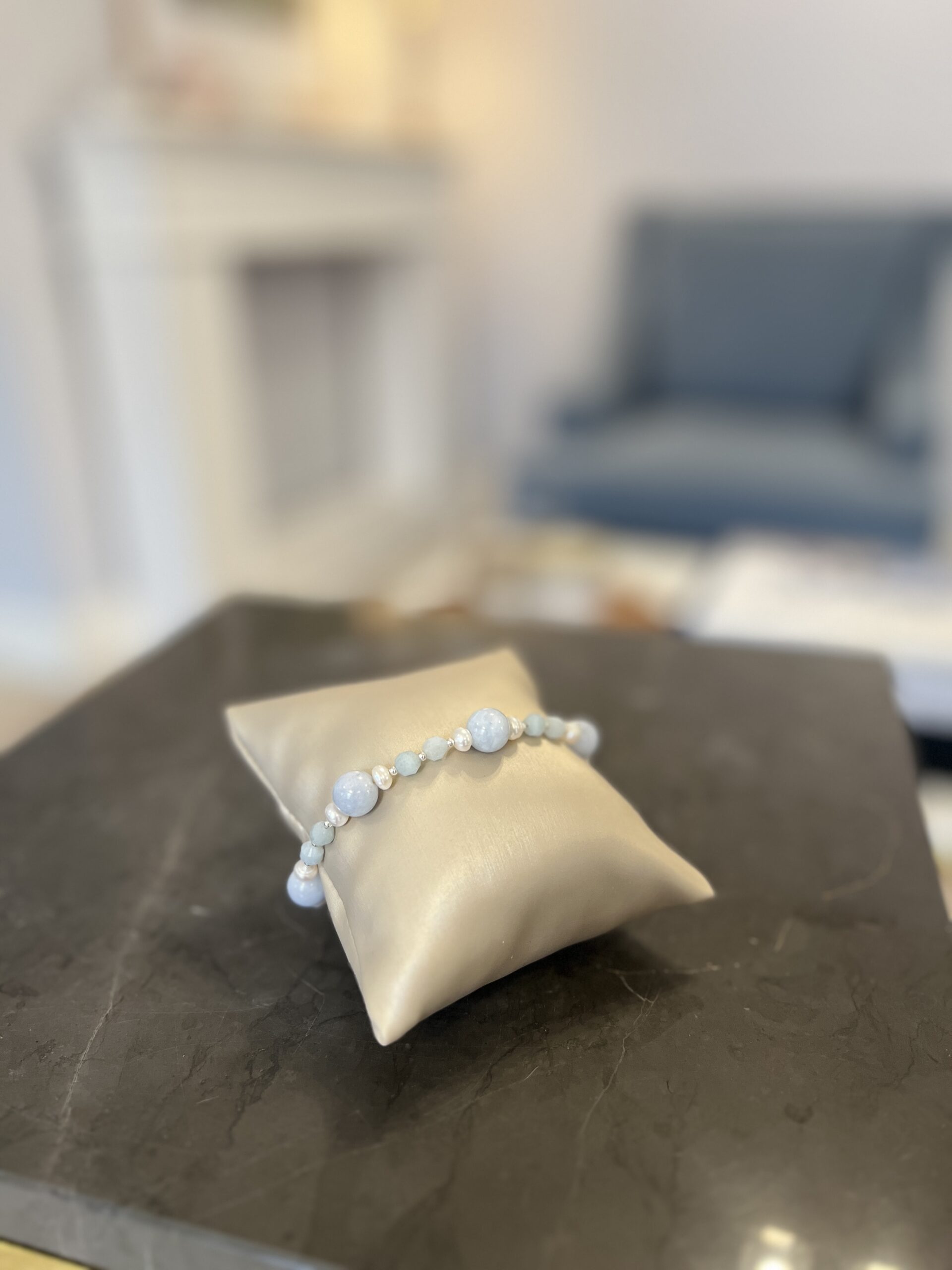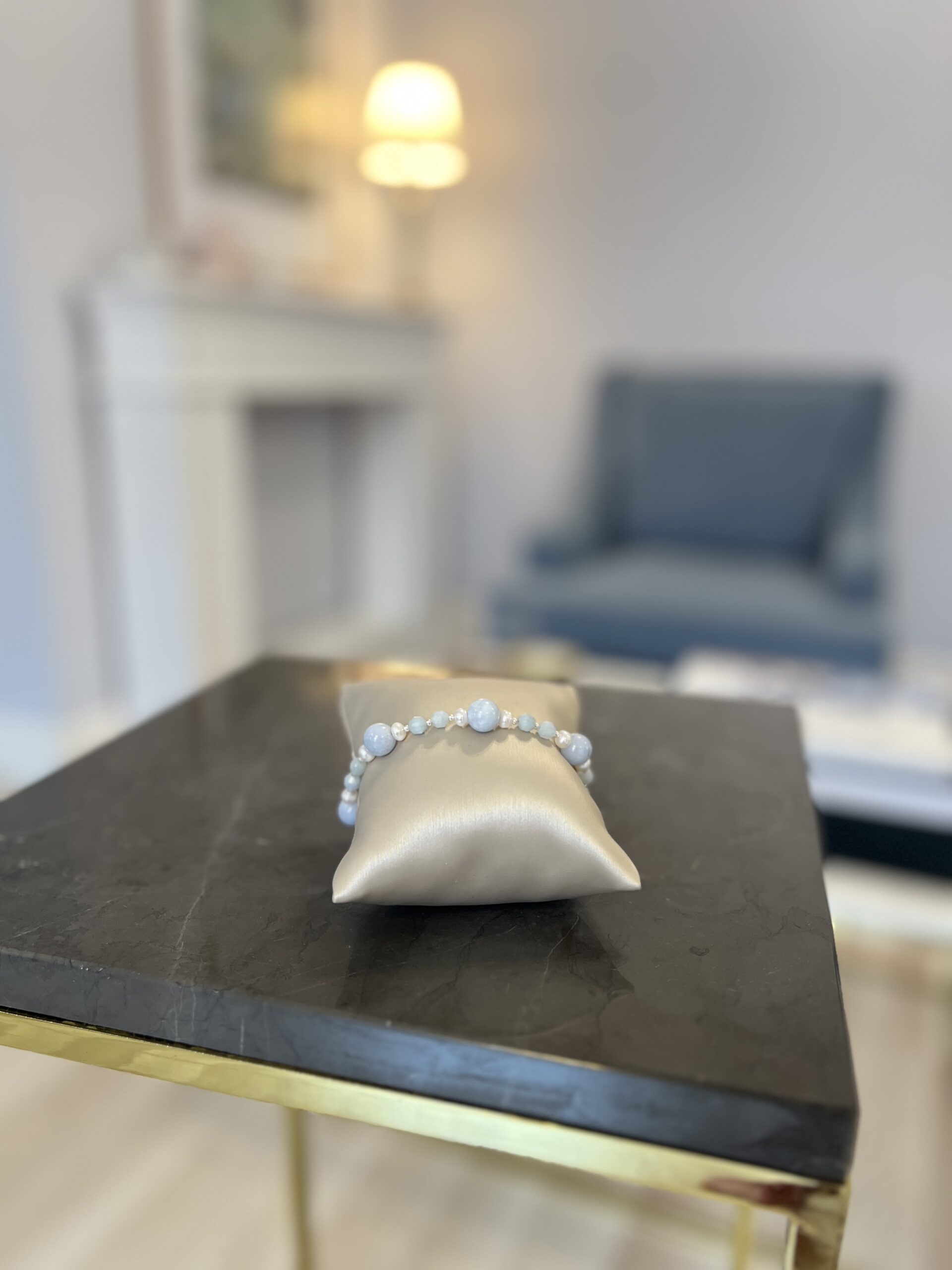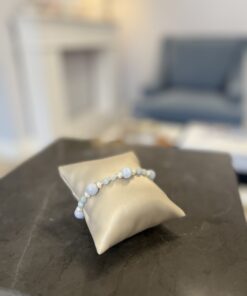 Bardzo kobieca i dekoracyjna, delikatna bransoletka TIAMO pearl to nasz topowy model w wersji srebrnej – uniwersalny, pasujący do każdej biżuterii wykorzystującej: Akwamaryn, Perły ( kolorystyka delikatny błekit plus biel) Idealnie komponująca się z wiosenno-letnimi stylizacjami. Nada charakter każdej stylizacji, ze względu na ciekawe połączenie połączenie: bieli delikatnych pereł naturalnych, szlifowanych kulistych i fasetowanych kamieni Akwamarynu w 2 wielkościach z delikatnym srebrem. Klasyk, który zawsze warto mieć jako idealne uzupełnienie każdej stylizacji bazującej na elegancji i dobrym stylu.