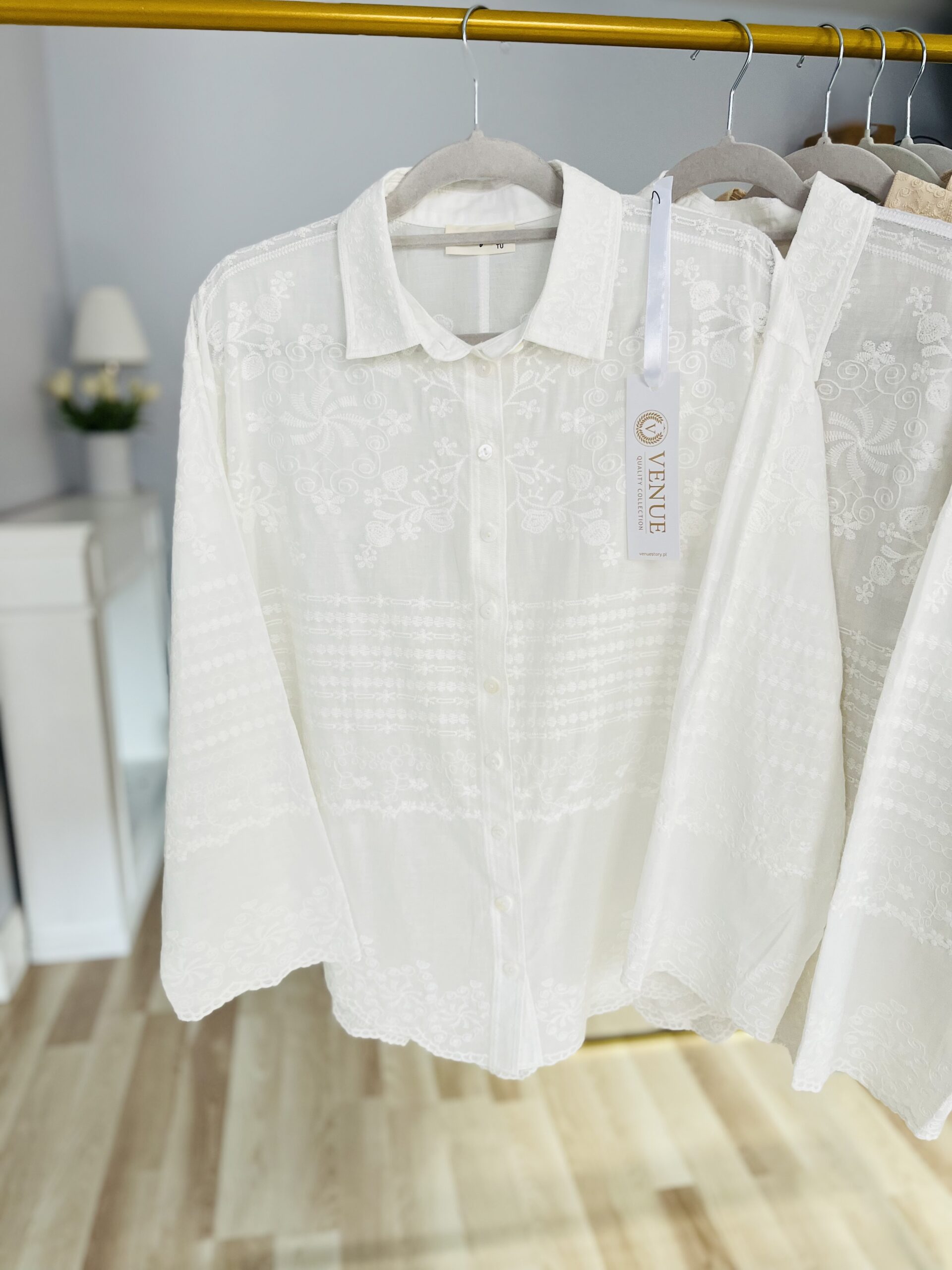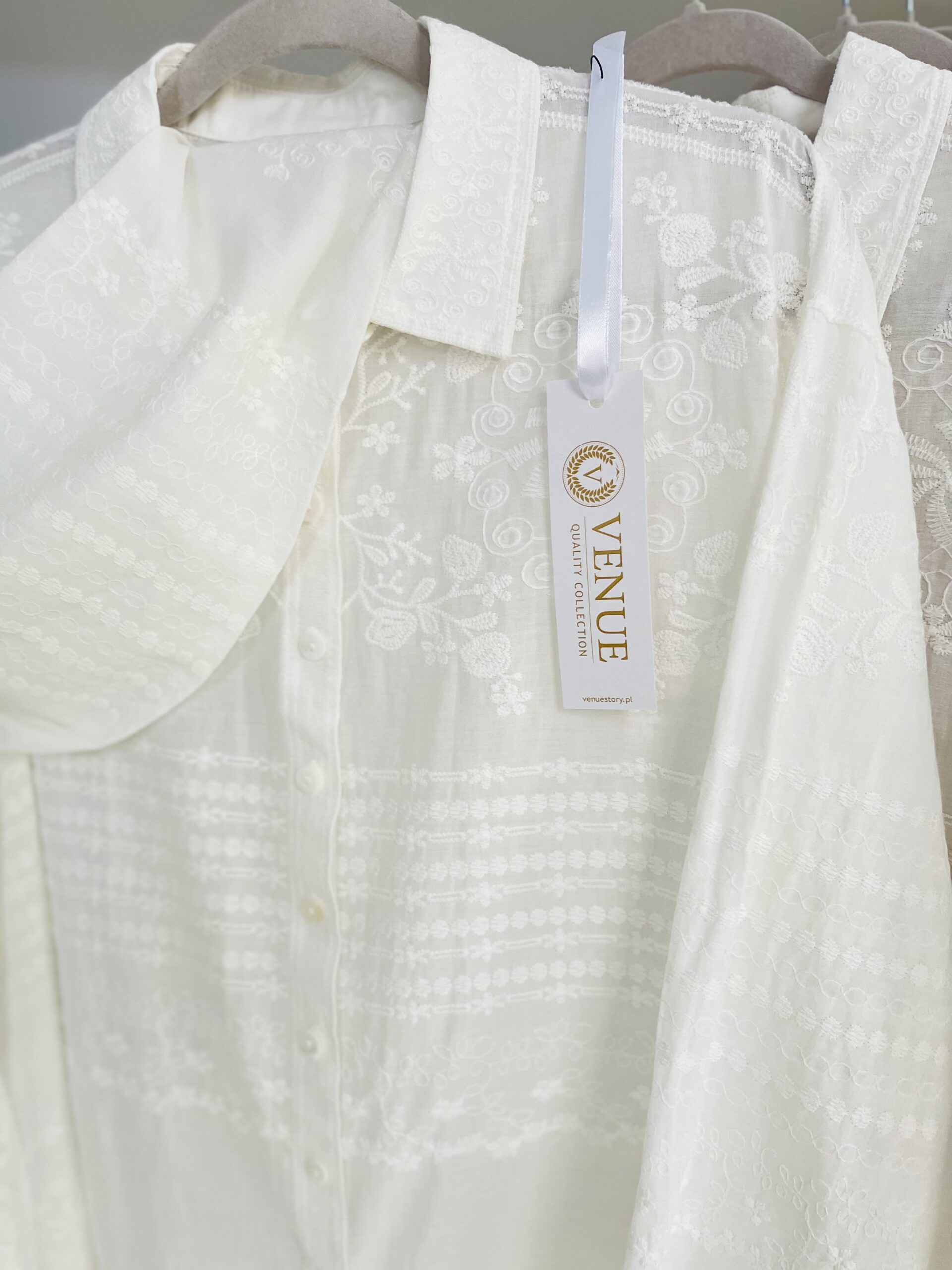 Lekka jak piórko, delikatna, koszula damska. DAFNE to koszula zapinana na guziki, z klasycznym kołnierzykiem. Eteryczna, cienka bawełna z bardzo delikatnym haftem w motywach roślinnych.