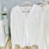 Lekka jak piórko, delikatna, o minimalistycznym kroju koszula damska. ELLA to koszula zapinana na guziki, z eleganckim kołnierzykiem wykończonym subtelnym dekoracyjnym przeszyciem wzdłuż krawędzi. Dół koszuli wyróżnia się ozdobnym, półokrągłym wykończeniem z haftowanym wzorem, który daje lekkości i kobiecego uroku.