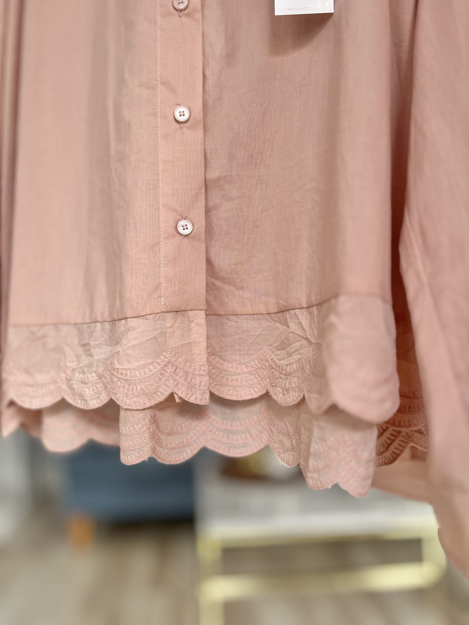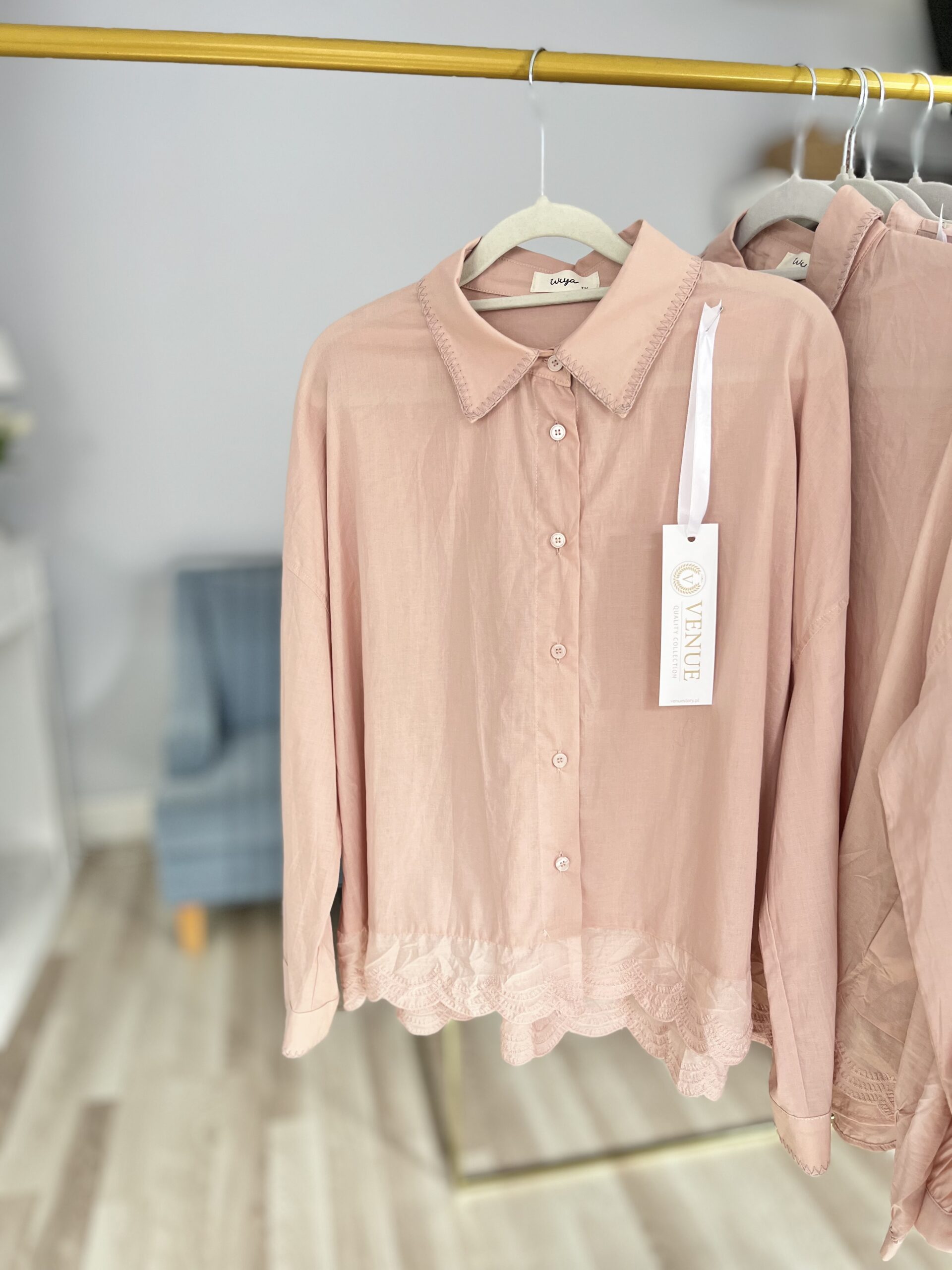 Lekka jak piórko, delikatna, o minimalistycznym kroju koszula damska. ELLA to koszula zapinana na guziki, z eleganckim kołnierzykiem wykończonym subtelnym dekoracyjnym przeszyciem wzdłuż krawędzi. Dół koszuli wyróżnia się ozdobnym, półokrągłym wykończeniem z haftowanym wzorem, który daje lekkości i kobiecego uroku.