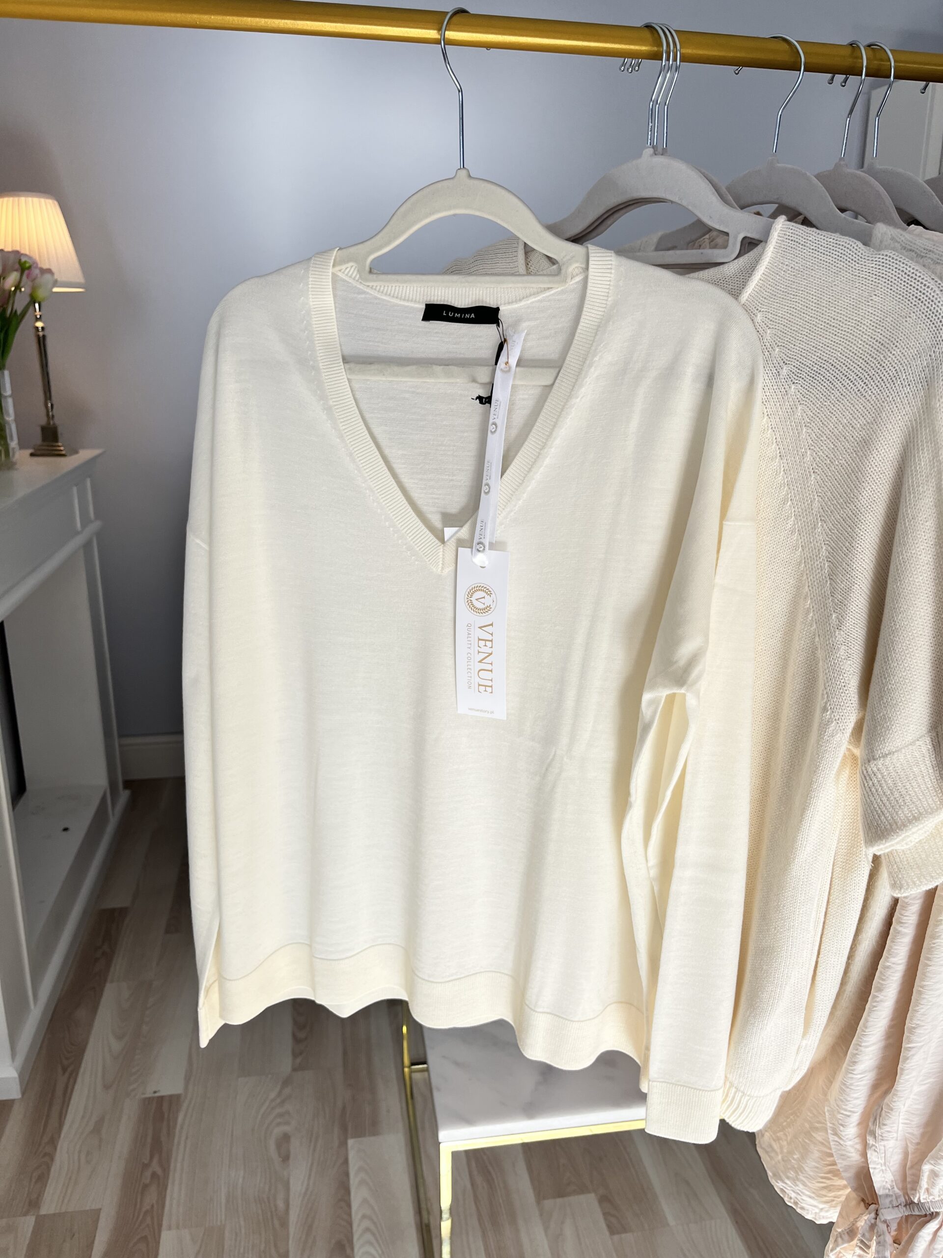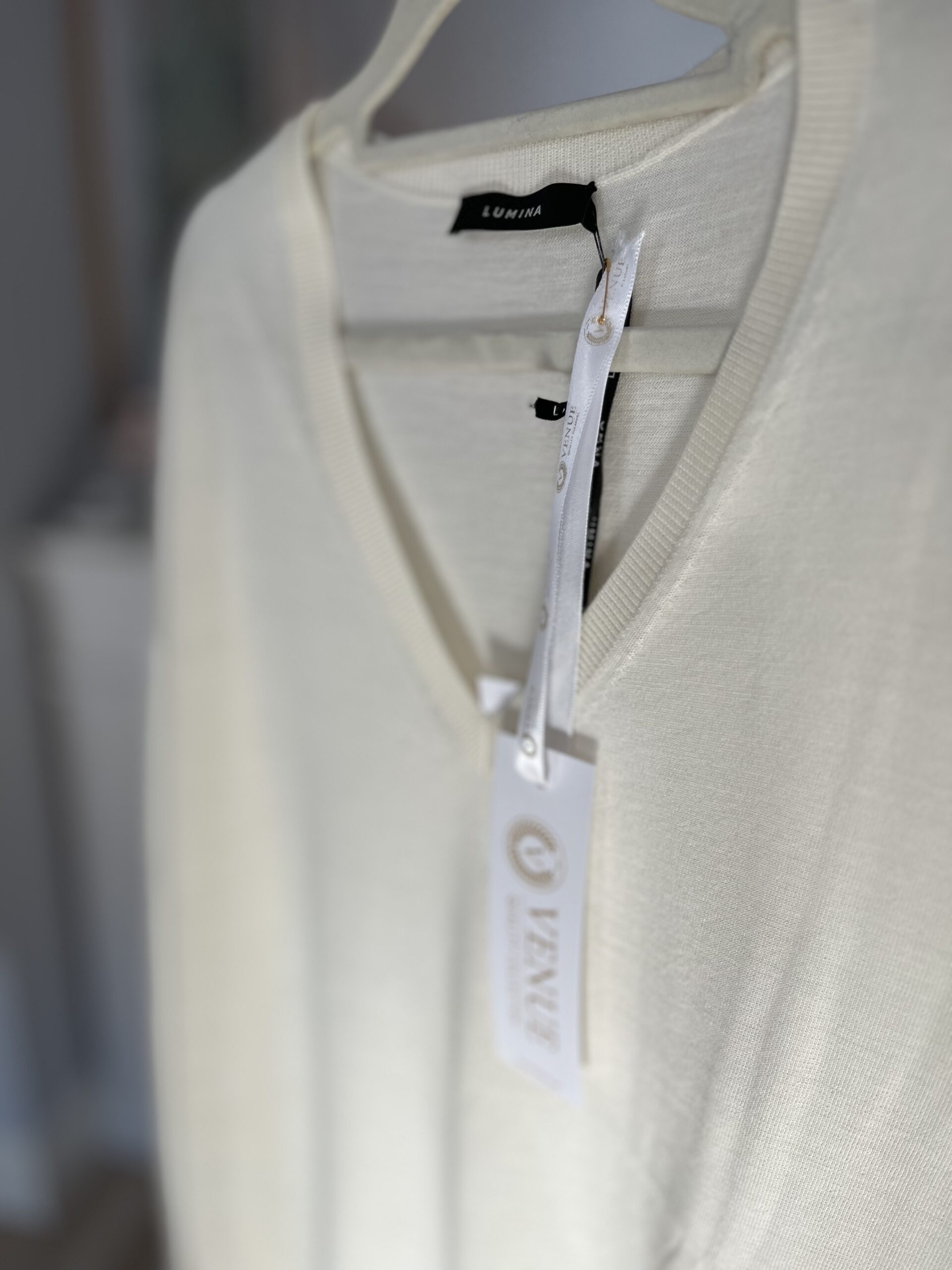Klasyczny dekolt w serek dodaje sweterkowi elegancji, pozwalając na swobodne noszenie go solo / na gołe ciało. Jest cieniutki i bardzo lekki. Świetnie komponuje się zarówno z jeansami, jak i eleganckimi spodniami, tworząc doskonałą bazę do różnych stylizacji.