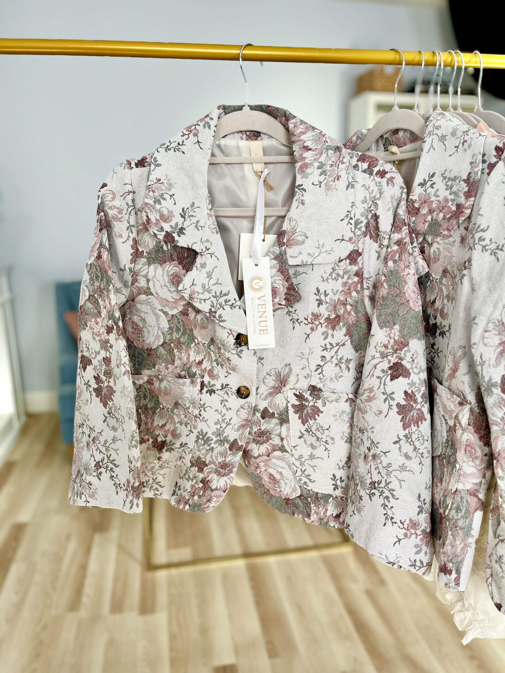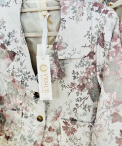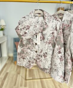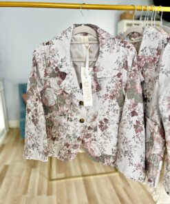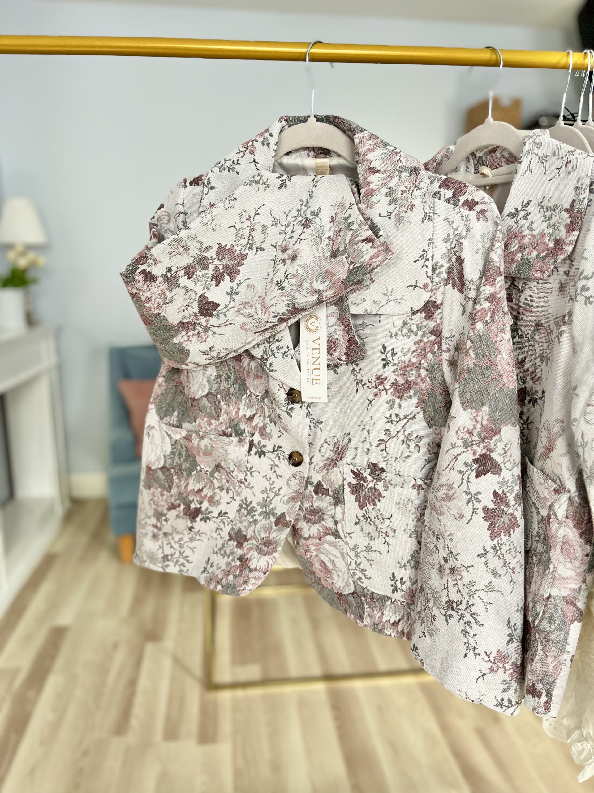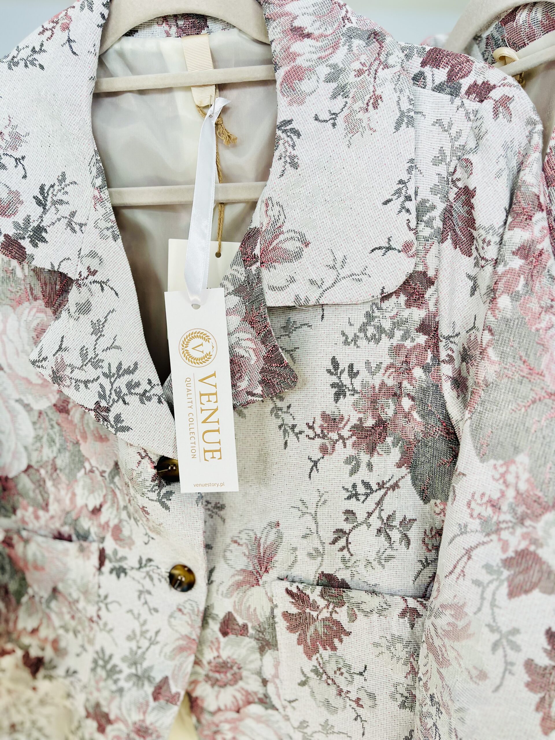 Żakiet wiosenno letni z motywem ogrodowych kwiatów to krótka forma, o komfortowym kroju nie krępującym ruchów. Idealny element wiosennych stylizacji bazujących na budowaniu warstw.